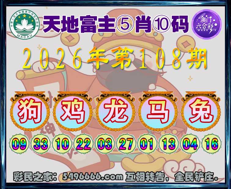 108期: ✌️『天地富主』 ✌️⑤肖⑩码✌️【狗鸡龙马兔】开:00准